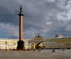 Heart of Saint-Petersburg, Palace Square placed between Nevsky avenue and embankment of Neva river. Lined by the imperious Winter Palace (now 'Hermitage') and the sweeping majesty of the General Staff building, this square is one of the world's most impressive inner-city expanses.