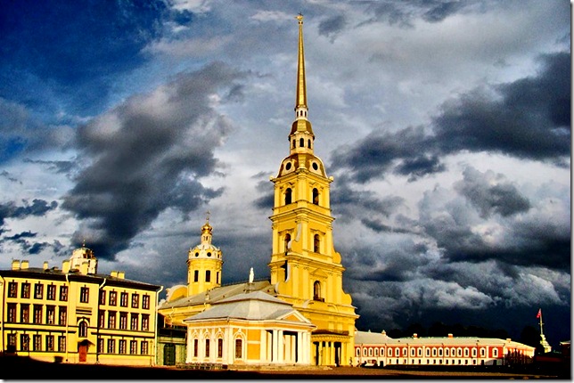 In 1712 Petersburg became the capital and the main cathedral was to be built. The construction works lasted till 1733 headed by Domenico Tresini, a Swiss architect who has designed a number of outstanding buildings in Early Baroque style. But this is truly his masterpiece. The rectangular shape is unusual for an Orthodox church. The building is dominated by a tall belfry which is designed in tiers but appears as a single whole. This belfry is over 408 feet tall and still remains the highest architectural structure in Petersburg. The spire was erected in 1724. The Angel on top of it is a weather-vane. It is 10 feet high and its wing-span is 12. There is a legend that in 1830 when it was damaged during a storm a courageous roofer Piotr Telushkin climbed the top of the spire using just a rope and fixed it in 6 weeks.